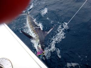 水温は23.7℃に低下しており、カジキが見えてもヒットしてこないタフな状況でした そんな中、カジキのストライクもこのエリアに集中し、合計13回あって、マカジキ4尾、クロカジキ2尾、計6尾のカジキがあがりました。