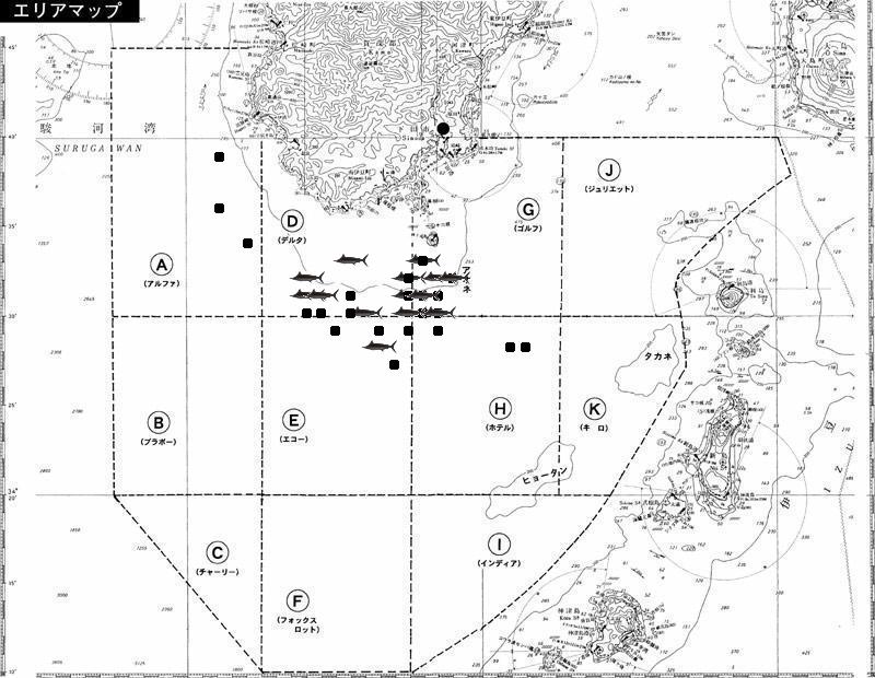 ★海域内のカジキマークは、キャッチ、またはT&Rされた位置。■マークはバラシた位置です。同じ緯度経度のものは、1尾しか表示されていません。