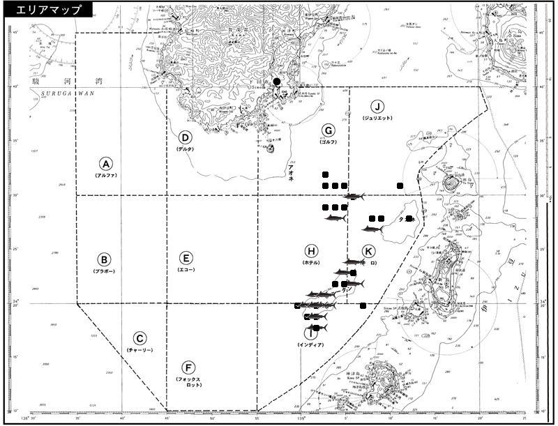 ★海域内のカジキマークは、キャッチ、またはT&Rされた位置。 ■マークはバラシた位置です。同じ緯度経度のものは、1尾しか表示されていません。