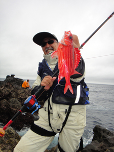 石鯛釣り歴ン十年で初めて釣ったという赤い魚と大会会長の丸橋氏