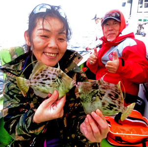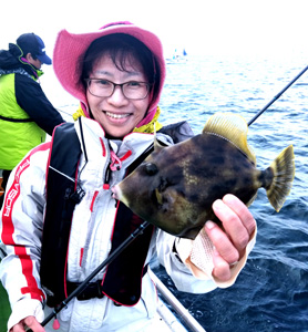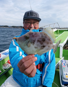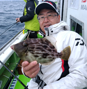 スタート直後は天候は曇減れ時々曇、やや北風がありましたが、微妙なアタリをとるこの釣りにはさほど影響なく、条件としてはまあまあでした。まずは小網代港を出たところの水深30mから40mの根ぎわを攻めていきます。アタリは結構あるのですがなかなかハリガカリさせることが難しい、この釣り独特の状況。その中でも左舷大ドモに入った浅野千明さんがたて続けに検量サイズのカワハギを3枚、4枚とゲットしていきました。底を静かに誘いながら釣っているとのこと。毎回カワハギ以外のベラ、トラギスなどが先にエサに来てしまいますが今回はそれも少なかったようです。中にはメイチダイなどが釣れた人もありました。