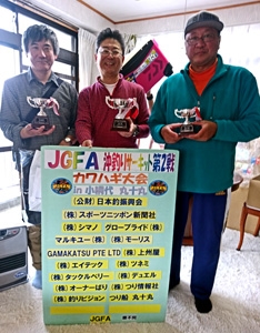 (1)表彰式です。優勝の平澤貞三さん(中央・3尾合計784g)、2位の浅野俊吾さん(左・同746g)、3位の柳田浩一さん(右・同654g)。おめでとうございました!
