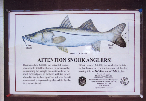 これは米国・フロリダ南部のボート乗り場にあった、スヌークという日本のスズキに似た魚の「スロットリミット」を示す看板です。この魚の持ち帰り可能サイズは、2006年7月13日より、1インチ動かされ、26~34インチ(65~85cm)から27~34インチ(67.5~85cm)になりました。「スロットリミット」はじめ、詳細はPDFの記事の最後に説明があります。ぜひご覧ください。