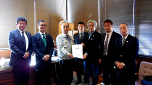 川島町長( 左から3人目)に義援金目録を手渡すJGFA・長鋪会長(右から3人目) |