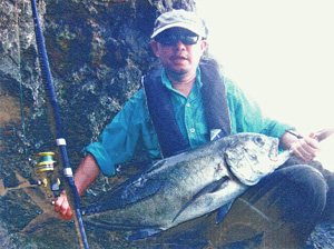 ●こちらも小笠原での快挙。JGFA釣魚保全委員長でもある猶原正和さん(千葉県習志野市)が狙ったのは、姉島のローソク磯。当日の海は比較的穏やかで追い渋りが気になったが、見事良型がヒット。使用ルアーはミノーのK-TEN BKF175。「取り込みはほんの3分。あまり時間は掛からなかった」と猶原さん。全長90cm、胴回り50cm。タグ&リリースしたので、まだ小笠原の海を泳いでいることでしょう。
