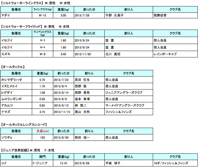 会員特典:(4)の記録申請料などを除きその他は一般のレギュラー会員と同等の資格を付与。タグ&リリースも代表者の名前でタグを無償供給。(ただし、カジキタグは従来どおり有償)
