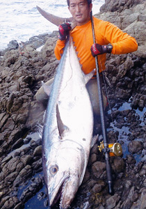 ●「この1尾にたどりつくまで15年掛かりました。納得のサイズ。会心のファイトでした」と喜びを語るのは、東京都豊島区に住む青木修さん。小笠原母島の磯でムロアジを餌にした泳がせ釣りで釣り上げた大物です。ヒット後、左右ばかりか沖に逃げ泳ぎハンドギャフで取り込むまでに約30分も要したようです。写真で見るように全長168cmの超ド級、胴回りも101cmありました。