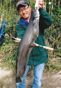 日本・世界記録をこれまでいくつもの保持する東京都羽村市の奥村文弥さん。今度は3.75kgの大型ナマズで世界記録のホルダーに。昨年の晩秋、ホームグラウンドの東京都多摩川でミノーにヒットした魚です。「護岸の水制ブロックに潜られて、引っ張り出すのに苦労しました」と奥山さん。リーダーはボロボロ、切れなくて良かったと話していました。全長72cm、胴回り38cm。