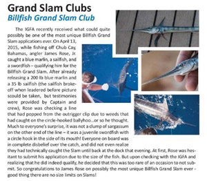 IGFA にはさまざまなスペシャル・クラブがありますが、「ビルフィッシュ・グランドスラム」というものは1日にカジキ類を3種類釣り上げた人が入ることを許されるクラブです。今年の4月、バハマでトローリングしていたジェームズ・ローズさんはまずクロカジキ、続いてバショウカジキを釣り上げ、さらにトローリングを続けたのですが、なかなか3尾めが来ません。ゴミが釣れてアウトリガーのクリップからラインが外れたので、装着しなおそうとリールを巻くと、なんとメカジキの子供がサークルフックにがっちりとかかって上がってきました。このクラブには重量や体長制限はありませんので、ローズさんは晴れて「ビルフィッシュ・グランドスラム・クラブ」の仲間入りを許されました。それにしても、これだけ小さいメカジキを目にすること、まして釣り上げることはじつに珍しいことです。日本でも似たような体験をされた方はいらっしゃいませんか? IGFA および JGFA のスペシャル・クラブ詳細は、2015年版イヤーブックの 104 および 105 ページをご参照ください。IGFA ルールブックにも掲載されています。