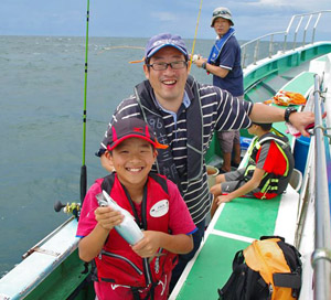「強い引きにびっくり」大サバを釣り上げて喜ぶ親子 |
