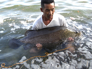 浦戸湾のアカメをやさしくタグ&リリースする岡田勝さん(写真提供:長野博光さん) |
