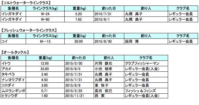 ▼表 彰 ヒラメ1〜3位(全長40㎝以上)、他魚1位のみ