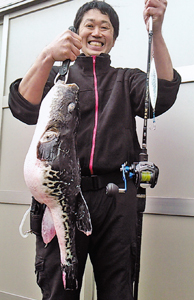 このところ新潟・柏崎沖でトラフグを連発しているのが新潟市に住む原田武さん。この日も柏崎市の「アシストクラブ金進丸」でジギングをしているとヒットしたのがこの魚。「サイズアップを狙っていました」と期待通りに掛けた魚が 6.38kgの特大。ライン16ポンド、ルアーは「NEISスイッチバックプロト180g」、フックは2本。