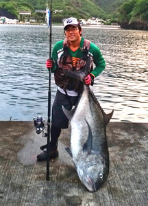 狙い通り、防波堤からトップウォータープラグのキャスティングで大型ロウニンアジをゲットした森山祐樹さん |