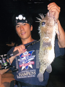夏休みを利用して仲間と小笠原父島へ遠征したのは横浜市の西野勇馬さん。これまでにも各魚種で日本・世界記録を数々ゲットしていますが、今回はこれまでに狙ったことのないエリアでの大物にチャレンジしました。一見、ハリセンボンやイシガキフグに見える魚ですが、標準和名はネズミフグ。「魚の切り身を餌にブッ込みで上げました」と西野さん。記録がまた一つ加わり大喜びです。