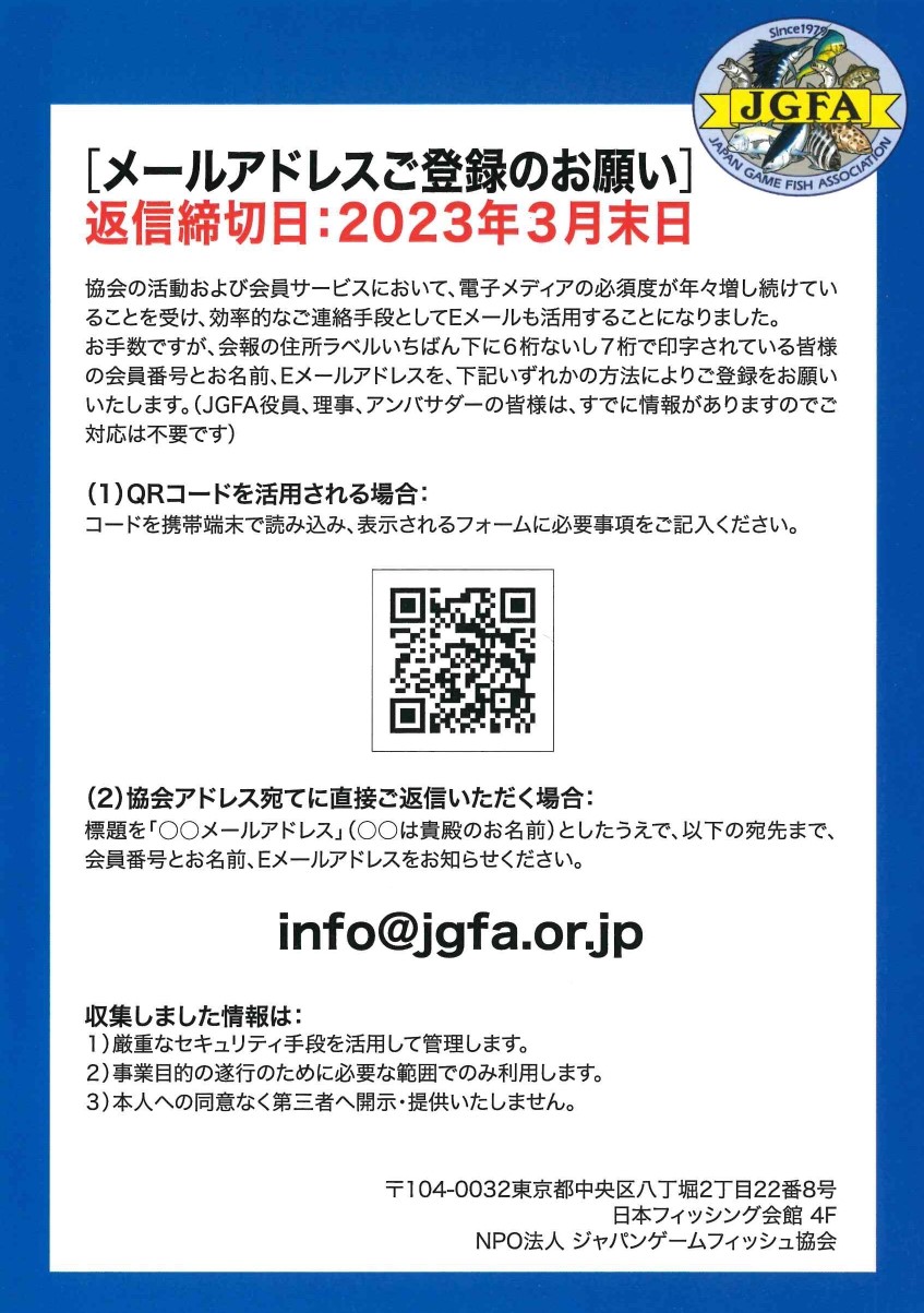 ★【JGFA沖釣りサーキット2023】に参加してみませんか? 9月24日タチウオ大会11名申し込み中(残り11席) 10月22日ヒラメ大会13名申し込み中(残り5席) 11月19日カワハギ大会9名申し込み中(残り11席) 12月10日アマダイ大会9名申し込み中(残り11席) マゴチ大会も好評の中開催されました。 https://www.jgfa.or.jp/news/evnt-rslt/p000899.html この機会にIGFAルールでの船釣りに参加してみてはいかがでしょうか。 普段の船釣りとは一味違うこと間違いなし! ★詳しくはこちらをご覧ください↓ https://www.jgfa.or.jp/news/event/p000991.html