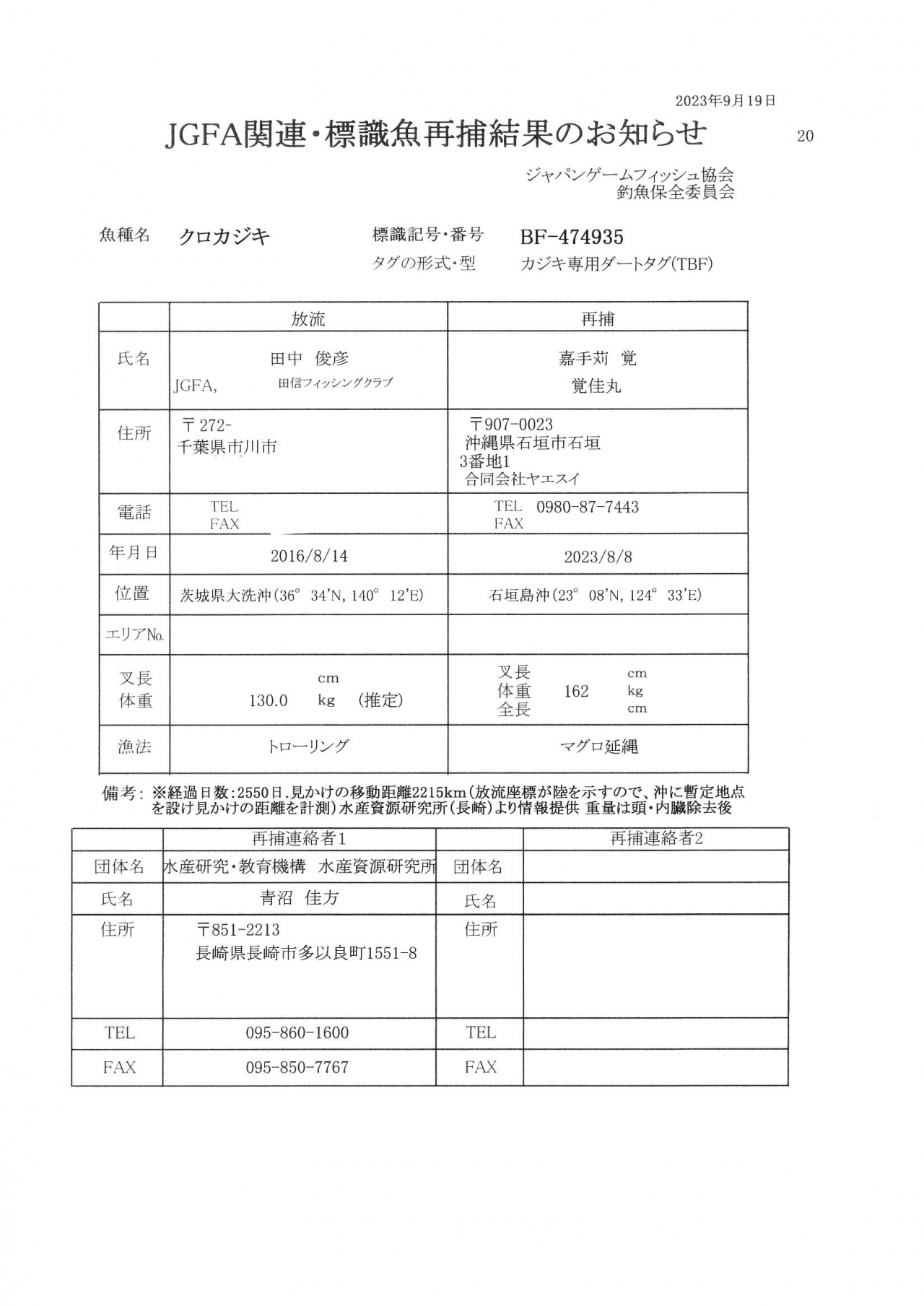 2023年9月19日にクロカジキの再捕情報が、長崎県の水産資源研究所から届きました。