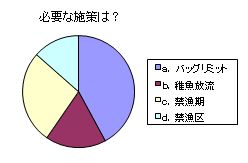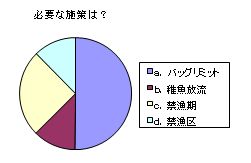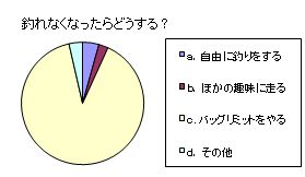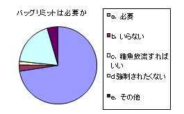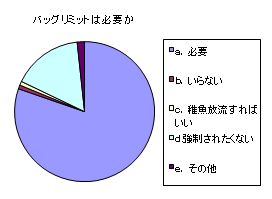 ★このままでは、釣れなくなるから、バッグリミットが必要とした人が8割、強制はいやだが自分なりにバッグリミットをやればいいという人が1割5分。つまり、バッグリミットは、必要と答えた人は9割5分に達してほとんどがバッグリミットを必要と考えているようだ。