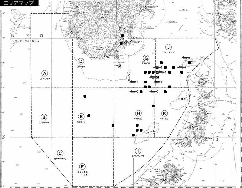 エリア的にトンガリからウドマアワセにかけてのエリアJ(ジュリエット)でヒットが集中しました。他には、ヒョウタンを含むエリアH(ホテル)辺りもカジキのヒットがみられました。結果をご覧いただければ一目瞭然です。