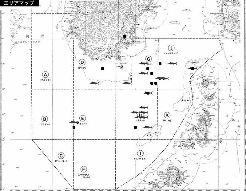 ★海域内のカジキマークは、キャッチ、またはT&Rされた位置。■マークはバラシた位置です。同じ緯度経度のものは、1尾しか表示されていません。