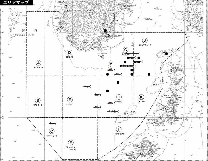 ★海域内のカジキマークは、キャッチ、またはT&Rされた位置。■マークはバラシた位置です。同じ緯度経度のものは、1尾しか表示されていません。