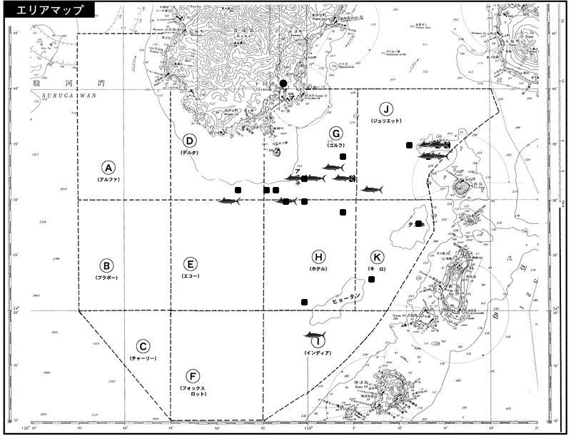 ★海域内のカジキマークは、キャッチ、またはT&Rされた位置。 ■マークはバラシた位置です。同じ緯度経度のものは、1尾しか表示されていません。