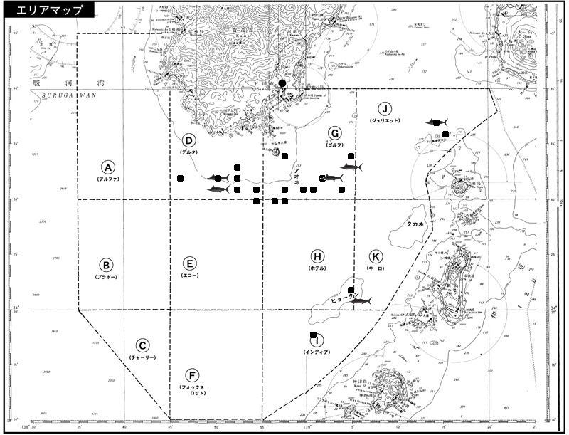★海域内のカジキマークは、キャッチ、またはT&Rされた位置。 ■マークはバラシた位置です。同じ緯度経度のものは、1尾しか表示されていません。