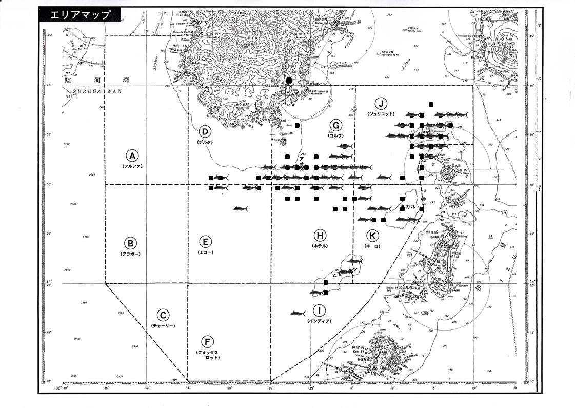 ★海域内のカジキマークは、キャッチ、またはT&Rされた位置。 ■マークはバラシた位置です。同じ緯度経度のものは、1尾しか表示されていません。