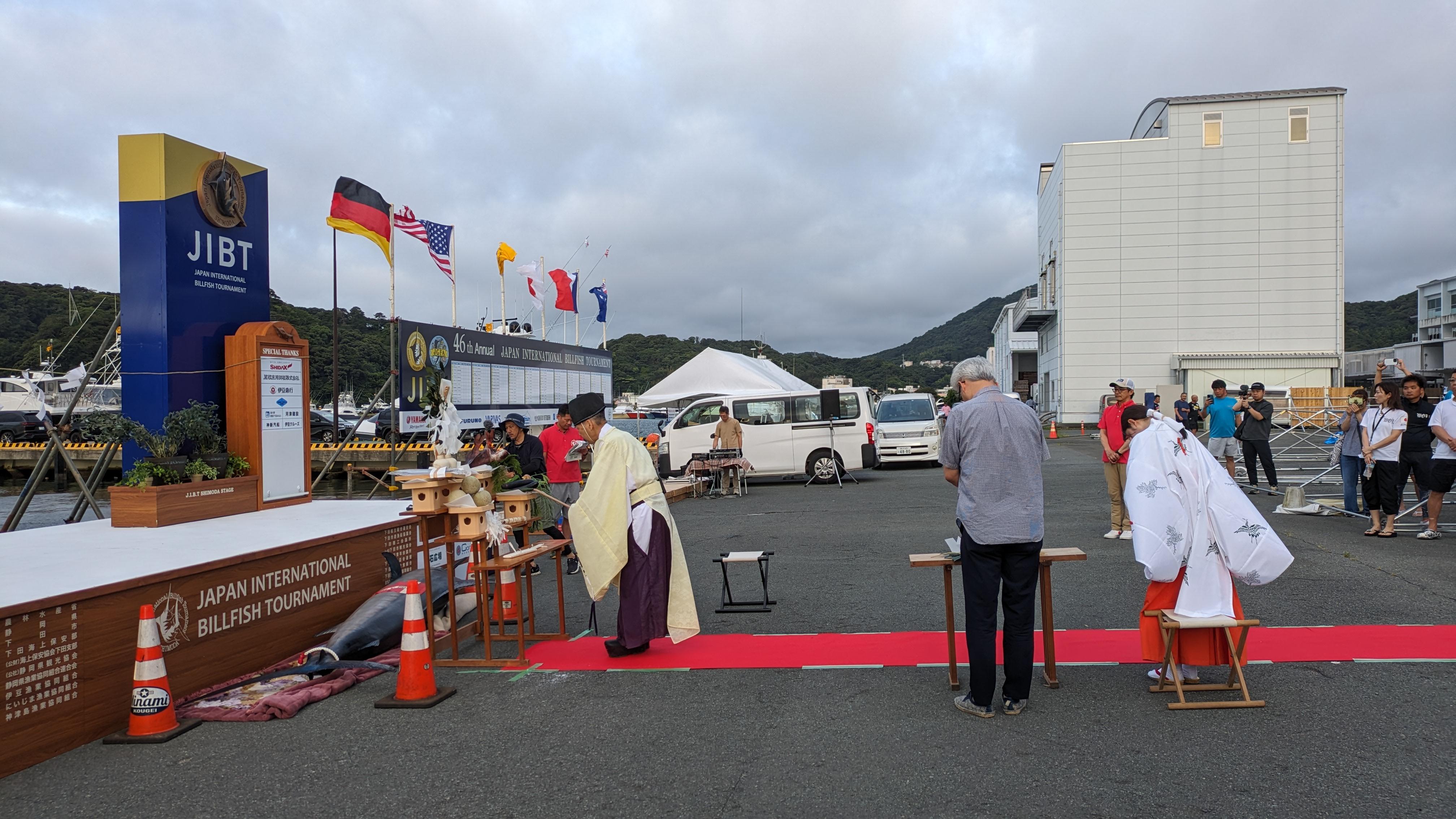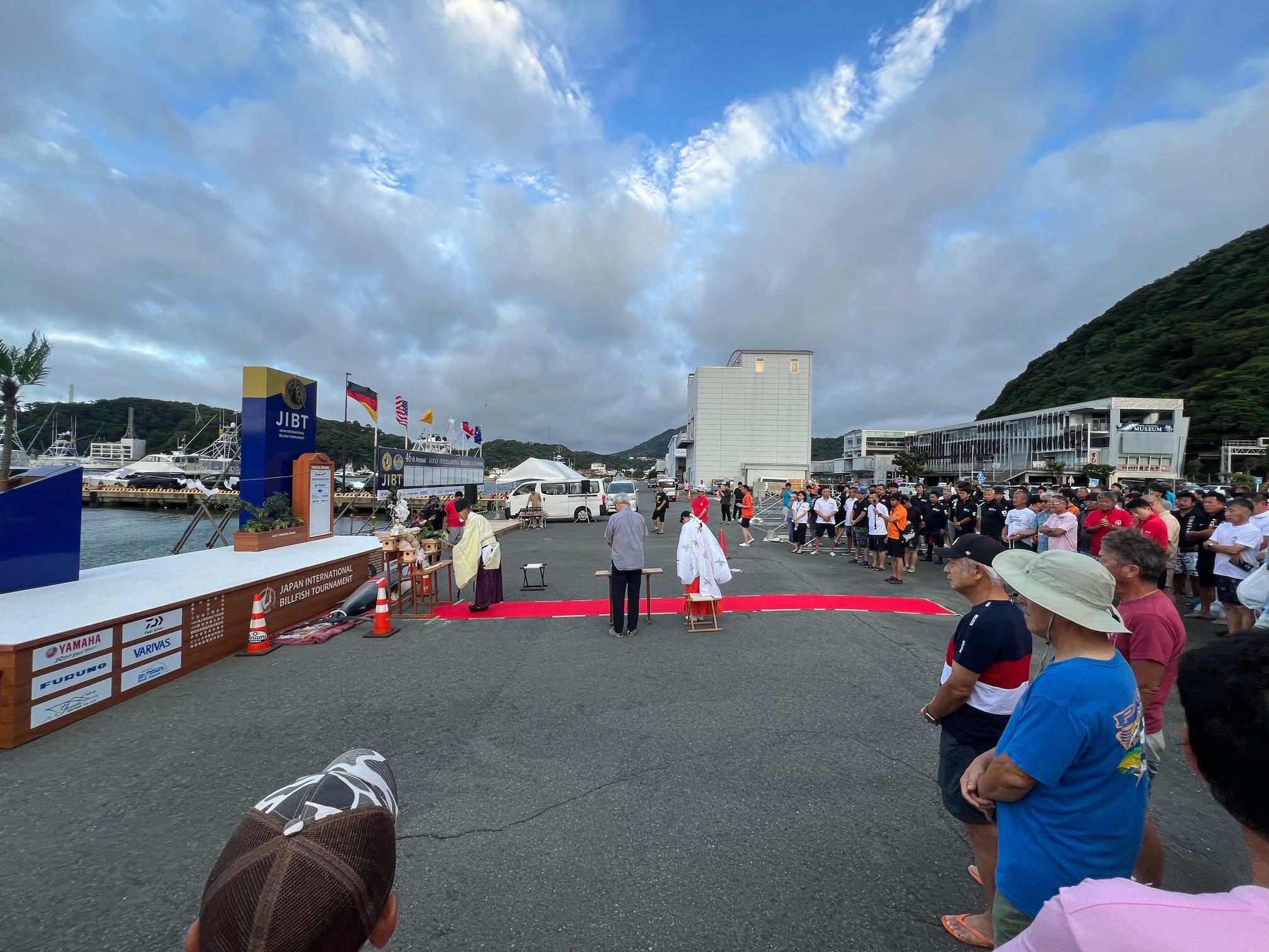 今年で46回目となるJIBT初日は、朝から蒸し暑く時折太陽が覗くものの、前日に引き続き下田沖で風速10m前後の風が吹くような条件となり、沖合は2.5m程度の波も残っています。釣り自体は出来ないことはないですが、ボートで安全に釣りをする条件が整っているとは言えない状況となりました。