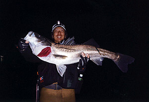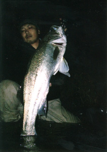 静岡県御前崎に住む平出輝(ひかる)チャンは10才 の女の子。小学校入学前からシーバス釣りをはじ めたもののなかなか釣れず、初めて釣ったシーバ スがなんとこの70cmで、お父さんも大喜び。