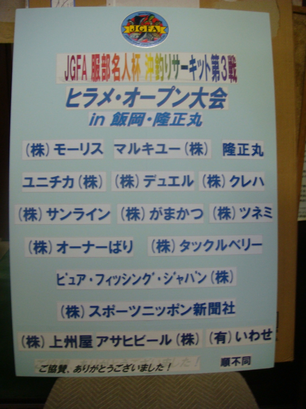 アサヒビール(株)、(有)いわせ、(株)オーナーばり、(株)がまかつ、(株)クレハ、(株)サンライン、(株)上州屋、スポーツニッポン新聞東京本社、タックルベリー、(株)ツネミ、(株)デュエル、ピュア・フィッシング・ジャパン(株)、マルキユー(株)、(株)モーリス、ユニチカ(株)、(有)隆正丸