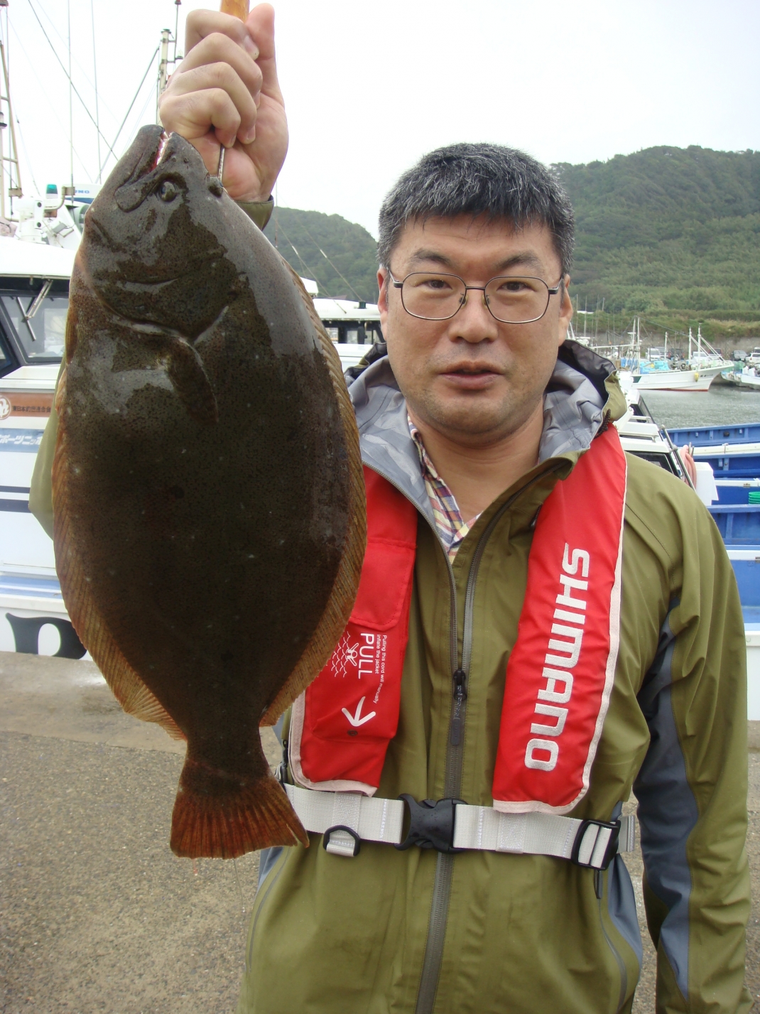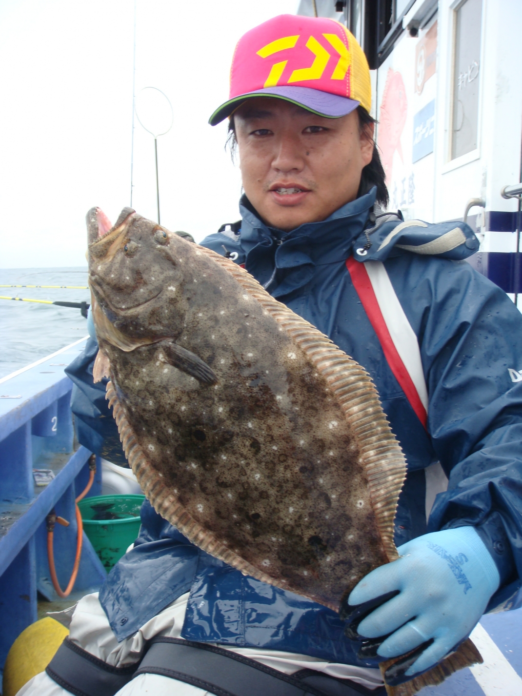 台風通過後のこの日、様子がいつもとまったく違っていました。一般参加者17人が乗船した18号船(田村光二船長)は、連発を期待した朝のゴールデンタイムが不運にも不発。北東風と雨。ウネリも高く、繊細な当たりを取る釣りとして条件は最悪。「渋い。底荒れの影響だね。さて、ジャンケン大会の練習でもしようかな」--船中でそんな軽口も聞こえてはいましたが、その沈黙を破って左舷で上がったのはイナダ。その直後、右舷で本命第1号がヒットしました。実に開始2時間後のこと。競技はIGFAルールでシングルフック2本、審査は40㌢以上のヒラメ1匹の重量で競われる大会。その後も船は移動を繰り返すうち、右舷胴の間で10時半に千葉県市川市の小林大祐さん(32=会社員)が1.30kg、52㌢を取り込みました。潮の影響からオマツリが続出する船中。それを避けて意表を突く仕掛けで狙っていたのが功を奏した格好に。「ハリス40㌢、捨て糸も20㌢と極端に短くしました」。どうやら条件に合わせた釣り方が的中したようです。この30㍍ダチでは右舷側の数人に当たりが出て2尾釣った人も。