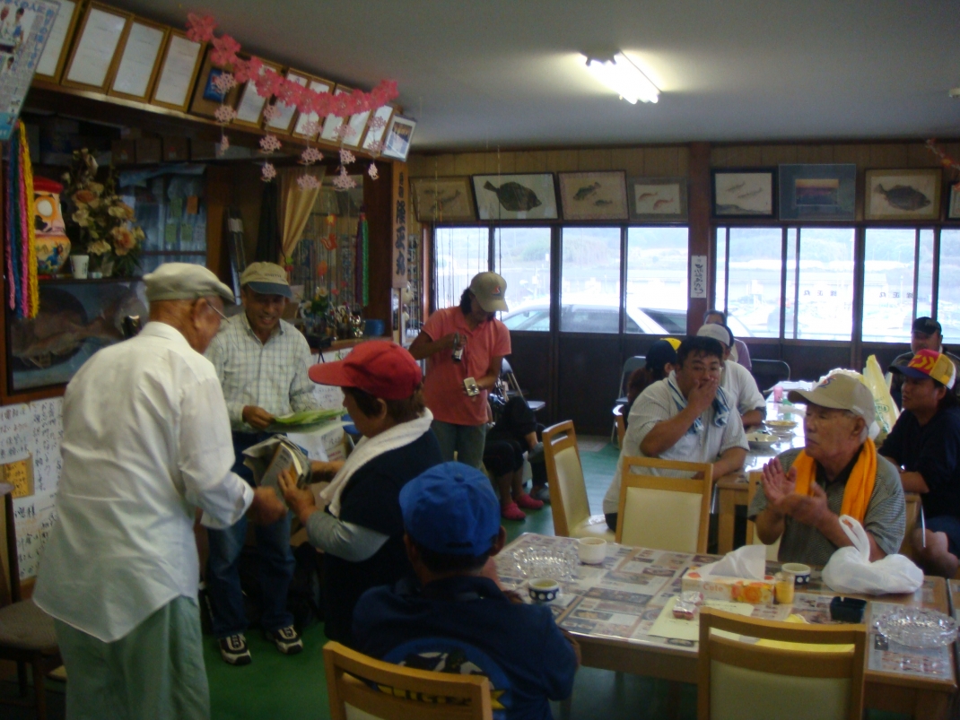 大会後は隆正丸の待合室を貸し切っての和やかな時間を楽しみました。参加者から集められた稚魚放流寄付金は隆正丸を通して県漁連に手渡されることになりました。