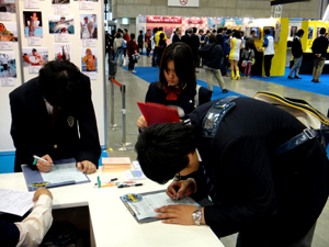にぎわうJGFAブースでアンケート調査に答える来場者