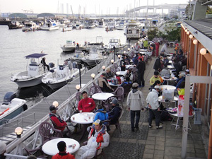 5時の開場から選手が集まり始め、店内で受付を済ますと洒落た海テラスにてコーヒーサービスとお菓子や今や恒例、ニッスイ様ご提供の美味しいソーセージなど頂きながら、暫しの釣り談義で盛り上がります。(余談ですが、今年は立体駐車場が満車にならず、スタッフは良かったーと安心)