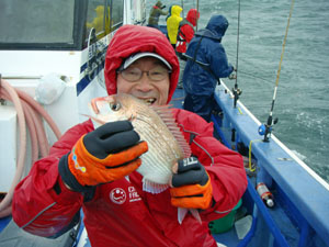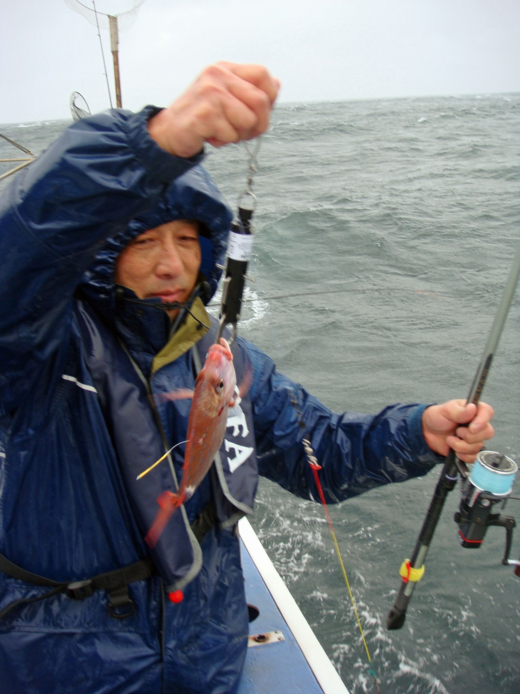 「JGFA服部名人杯沖釣りサーキット第2戦&オープン・マダイ大会」が4/21(日)、千葉県飯岡・隆正丸で開催され、50人が参加しました。対象は一つテンヤで狙うマダイですが、当日は北東強風と冬を思わせる冷たい雨にたたられ検量対象となる40㎝以上のマダイは残念ながら釣れず、帰港後の懇親パーティーはリリースサイズによるお楽しみの仮順位発表会&ジャンケン大会となりました。次回は、検量対象が釣れますように。