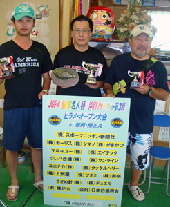【隆正丸の案内所で昼食後に行われた表彰式】優勝した森高雄さん(中央)と左は2位の鈴木匡さん。右は3位の宮井敏晴さん 手前のボードは賞品協力でお世話になった協賛メーカーさん。本当にありがとうございました。