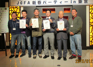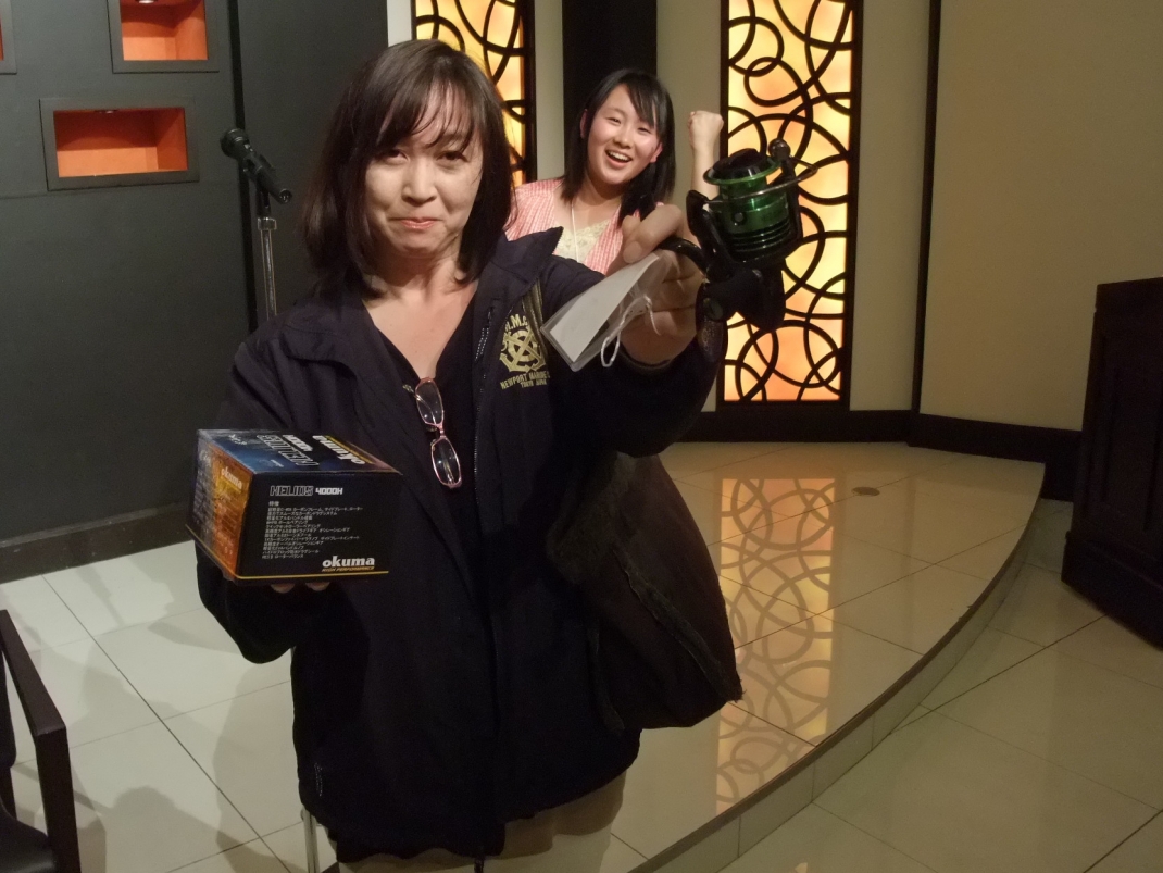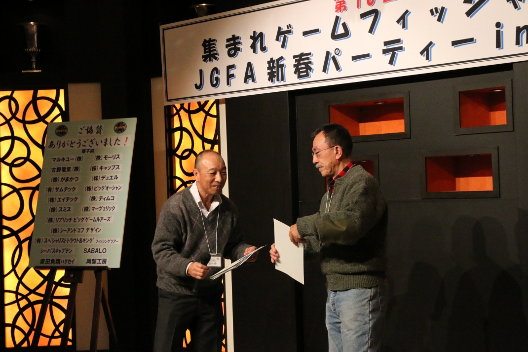 ステージではカジキ釣りの高橋一郎さん、奥山文弥さん、小菅綾香さん、北川真理さんら「JGFAアンバサダー」の紹介、2014「日本記録」「スペシャルクラブ」レコード獲得者の表彰、「JGFAライトタックルサーキット関東」「JGFA沖釣りサーキット」の表彰などが行われました。後半の山場は、豪華賞品がかなりの高率で当たるとうわさになっている(?)お楽しみの福引大抽選会。楽しい夜、仲間との時間はあっという間に過ぎていきました。