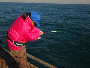 私は大物釣りの道具を持っていませんので、奥山先生からシイラ釣りの道具を借りました。もちろん海での投げ釣りは初めてでした。「いればすぐ掛かるよ。」西野さんのアドバイスで、誰よりも先に第1投。