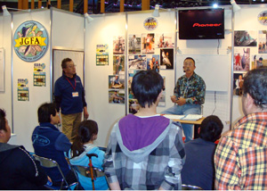 JGFAブースには一般の釣り人はじめ全国から集まったメンバーが大勢詰め掛け、連日ブースは大にぎわい。そのブース内には昨年1年間に認定された世界・日本記録者と魚のツーショットパネルが所狭しと全面展開、見る人たちの目を楽しませていました。また会期中は、JGFA副会長の丸橋英三さんよる身振り手振りを交えての「タグ&リリース」「バッグリミットの大切さ」など講演もあり、多くの人が足を止め、耳を傾けていました。