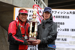 優勝は54cm ・2.63kgを頭に4尾釣りあげ、2尾総重量4.28kgをたたきだした小樽在住の高谷さん。2位は、44cm・1.4kgを頭に2尾釣りあげ、2尾総重量2.76kgだった喜茂別在住の押切さん。3位は38cm・1.08kgを頭に3尾釣りあげ、2尾総重量2.02kg だった旭川在住の下村さん。以上3名が上位となりました。