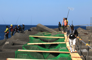 大会開催場所は、通年立入禁止の防波堤であり安全確保の足場、手摺り、落下防止ネット等を設置することで許可をいただいており、1回で安全に釣りができる人数が15名であることから、今回は2班に分け1班がこの防波堤ステージで競技している間、2班は沓形港の沖堤防周辺をボートロック(ボートからのロックフィッシュ釣り)する内容としました。競技時間は2時間半の交代で14日午後1時から6時まで、15日午前6時から11時までとして、大会順位は第1回目からと同じく防波堤ステージでの釣果で決めさせていただきました。
