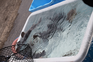 釣れた魚はいったん水槽で落ち着かせ、それからボートでリリースポイントに移送します。