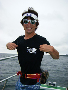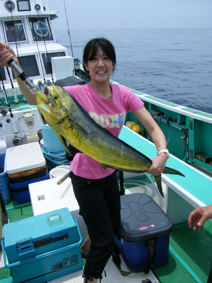7月にしては肌寒い中、4時の集合時間よりも早く参加者の方々が次々と到着し、参加者の熱い思いが実行委員にも伝わる。個々のスタッフが自分の仕事を予定通りこなし、迅速に受付を済ませ開会式〜乗船へとスムーズに移行。今回は、はるひら丸とよしゆき丸にご協力頂き二船に別れて乗船しJGFAルールによる2日間のサーキットである。都合4船計算でのシイラの最大叉長を競う大会だ。ベテラン揃いの猛者の参加者が続々と乗船し皆の顔つきも変わる。ゲストとして釣りドルのふくだあかりさんも参加し乗船前に早速盛り上がる。嬉しいことに海外からも大会の開催を聞きつけマレーシア観光協会所属マレーシア・フィッシングガイドのLAM氏も参加。全員の準備が整い待ちに待ったスタート・フィッシング!予報は終日雨から曇りに変わったが強い風と今にも落ちてきそうな黒い雲が参加者を戸惑わさせる。港を出ると高い波が船の速度を阻みシイラには不向きな悪条件が見事に揃ってしまうが参加者達は微動だにせずミヨシに立ち、皆がワンチャンスをモノにしようと全神経を海面に注ぐ。今回、私自身も2日間よしゆき丸に乗船したが この日は、初夏とは思えない冷たい空気と寒さに思わず上着を着てしまう。