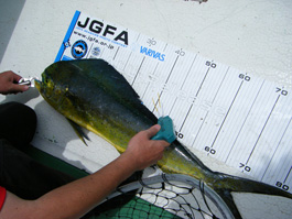 サイズに不満は残るがシイラを測定しタグガンでタグを打ってリリースしていく。そしてこの日一番活性の高いシイラの群れを見つけ、皆に次々とヒット!好調時の入れ食いとまで行かなかったものの 6本を無事ランディング。