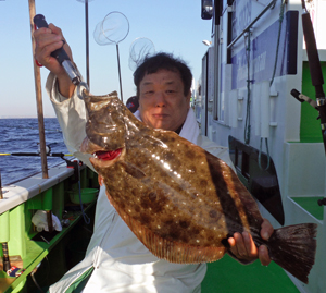 午前6時、船長の合図とともに釣り開始! 水深は約20m。その第1投で右舷ミヨシに釣座を構えた筆者の竿が大きく曲がったのです。いきなりのヒットに、思わず「根掛かり?」と思ったが、その〝根〟が動きだして上がってきたのは40cm級のヒラメ。この幸先いいスタートに船上のみんなが色めき立ちました。その後、右舷で当たりが連発です。そして午前7時、左舷トモの金子清次さんが、3kgクラスの本命を見事キャッチ!