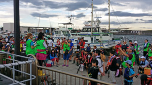 「日本釣りジャーナリスト協議会」と公益財団法人「日本釣振興会」の共催で2015年8月18日、神奈川県平塚市の庄三郎丸で「第16回親子釣り体験教室」が開催され、子供73人を含む137人が参加。7隻に分乗してライトタックルでサバ、マアジなどの釣りを楽しみました。