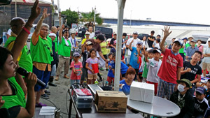今にも泣きだしそうな平塚新港で、大勢の参加者を前に開会式が行われました