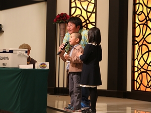 恒例の福引き大会です。男の子、女の子が元気な声で当たり番号をアナウンス