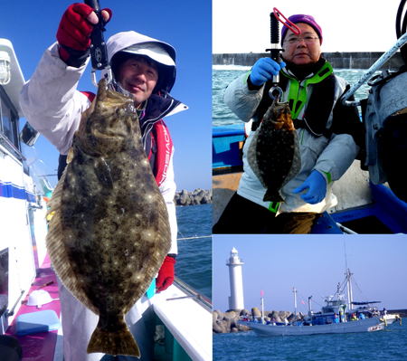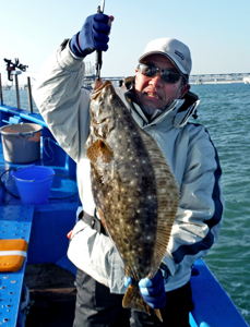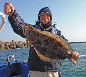水深は15m前後の砂泥地。何の当たりもなく時間が過ぎました。陽が昇り、辺りがようやく明るくなってきた頃、ふと防波堤に目をやると、白波が防波堤を軽々と乗り越え、流れ落ちる様はまるで「ナイアガラの滝」!様子を見ながら沖を狙うというプランはここで断念せざるを得えませんでした。底荒れ及び濁り、こりゃあ釣れないかもな~と思っていた時、左舷みよしの亀岡昇さんの竿が大きく曲がりました。慎重に巻き上げ、タモに収まった4キロ超えかと思われる良型ヒラメに、寒さで萎えかけていた皆の気持ちが一気に「釣るぞ!」に変わりました。すぐさま、右舷の池田義昭さんにも小型がヒット。しかし、その後はパタリと当たりが止まってしまいました。消波ブロック付近にポイント変えした直後、左舷大ドモの小松正訓さんに2キロクラスがヒット。続いて右舷みよしの井上一一さんにも良型ヒット。別船で釣っていた片田孝さんにも良型がかかったと無線が入りましたが、その後はまた音沙汰なし、本命の顔を拝めたのは15人中5名、他は当たりすらなく、午後12時、納竿となりました。